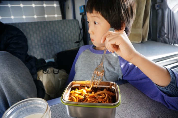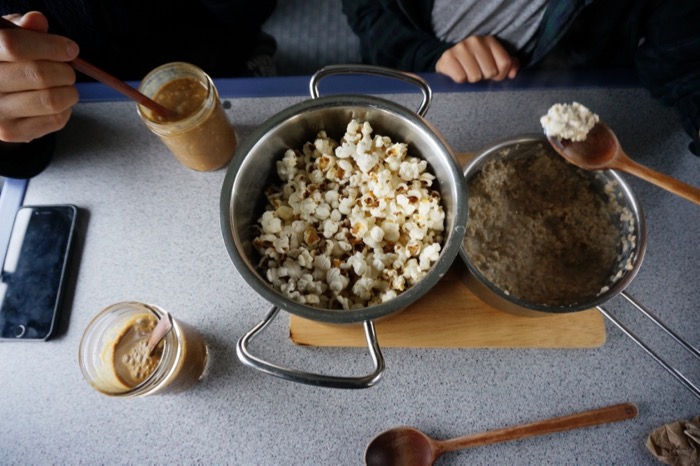 When you’re driving across Canada in a VW Westfalia camper van with two adults, a 9 year old and all our stuff, space can get tight at times. But to be honest, it’s a comfortable tight. And even cooler is when you get to have popcorn with your oatmeal for breakfast because we can. The drinks are hot soy milk with blackstrap molasses, btw. Yummy!