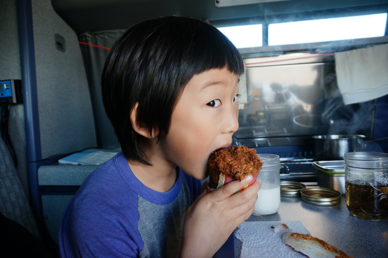 Last night, we stayed at a local Walmart and when we woke up, we were greeted with pumpkin and chocolate chip muffins made by Loretta. Ethan was happy to see them again, as usual, and was even happier to have a muffin for breakfast. Dong Eun also liked not having to cook.