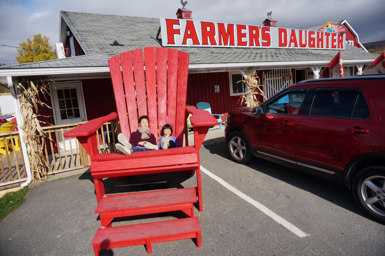 Before leaving, we bought their oat cakes and Ethan and Dong Eun had to get a photo with the giant red chair outside the store.