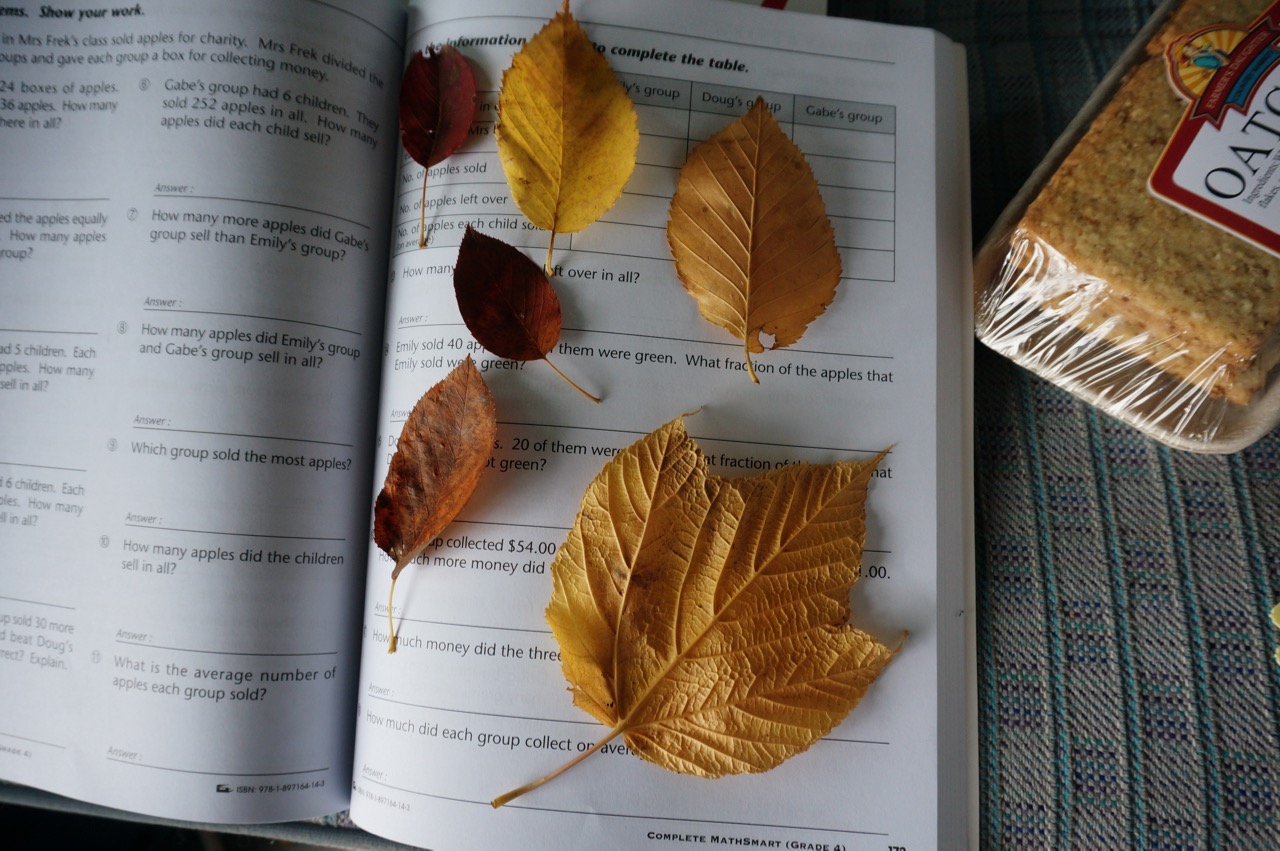 He then picked some leaves to press them using his new math book. This is something he learned from seeing Loretta do the same thing.