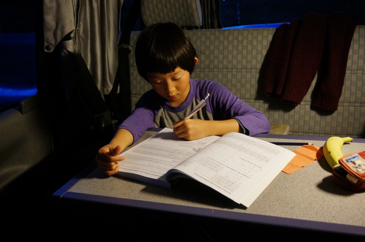 How amazing that the people here get to gaze up at the sky and see such a sight every night. Ethan ended the night by doing some math. He then stretched with Dong Eun to get ready for bed.