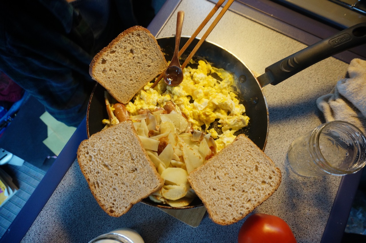 We had our dinner out in the Sobey’s parking lot. We usually do this. We buy our food, then cook and eat in the parking lot of wherever we are. It’s usually fine. Until tonight.