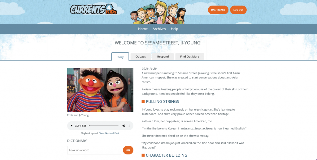 I’d heard that Sesame Street is introducing its first Asian muppet. For a show that is regularly praised for its representations of diversity, this seems long overdue. I think it’s good that Currents 4 Kids’ coverage of current events includes pop culture news like this, because popular children’s tv shows really do have an impact on society. Can you think of anything you saw in children’s media as a younger kid that you think influenced your perception of the world (in either positive or negative ways)?